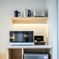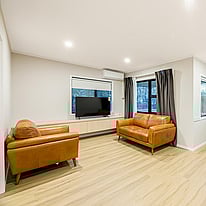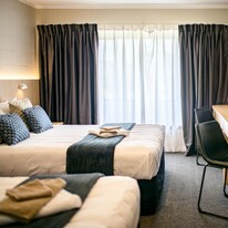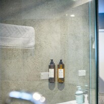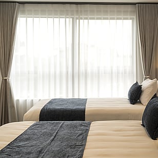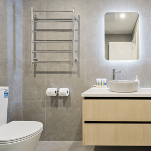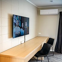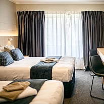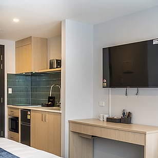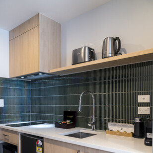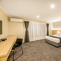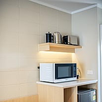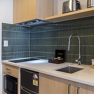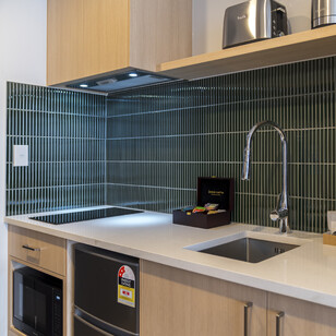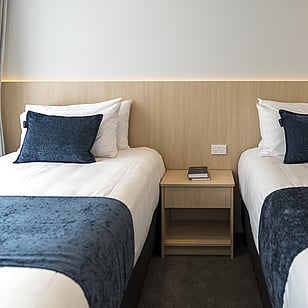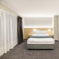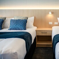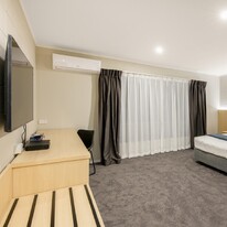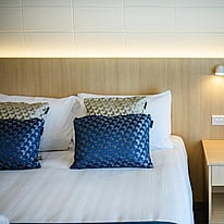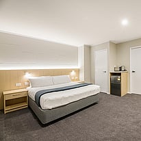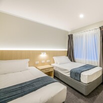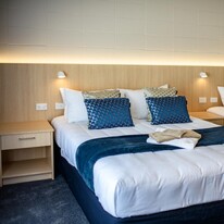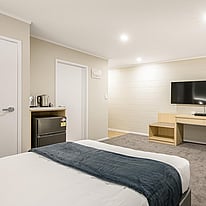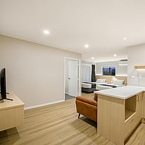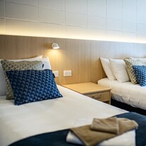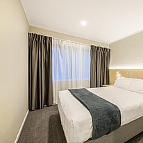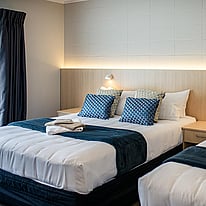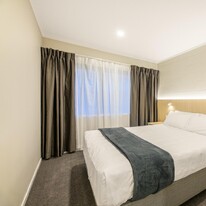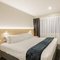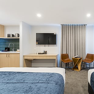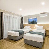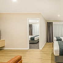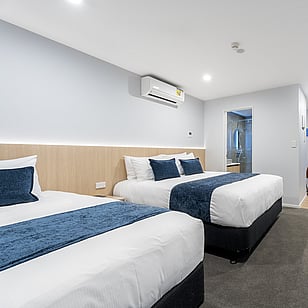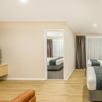 This two-bedroom family unit includes two separate bedrooms with a lounge and full kitchen, one queen-size bed, and two king-single beds.